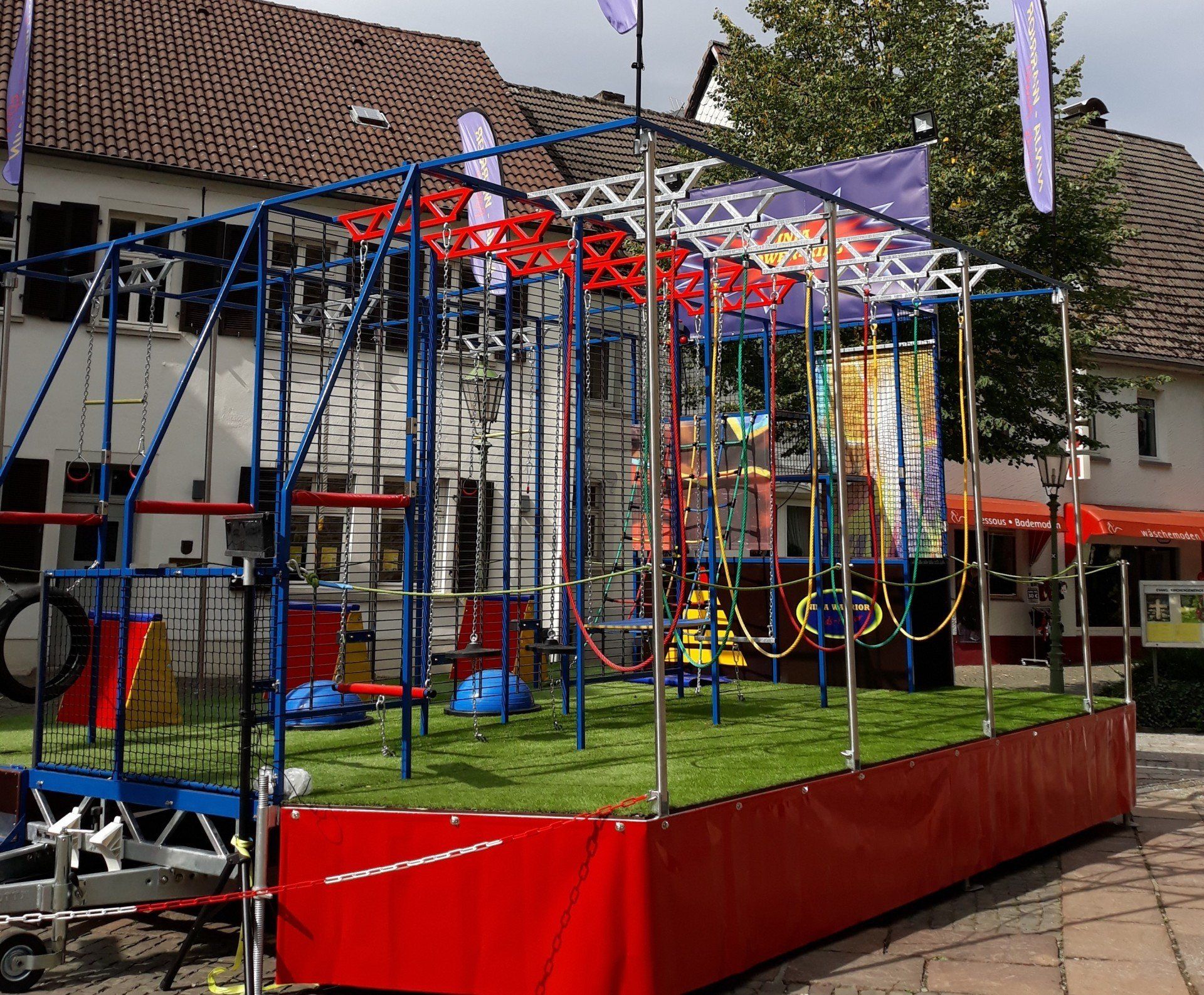 Die Vorteile für den Vermieter: alles auf dem Trailer integriert, schneller Auf- und Abbau mit nur einer Person, wetterfest. Das alles spricht für dieses Eventmodul Ninja Action-Warrior.